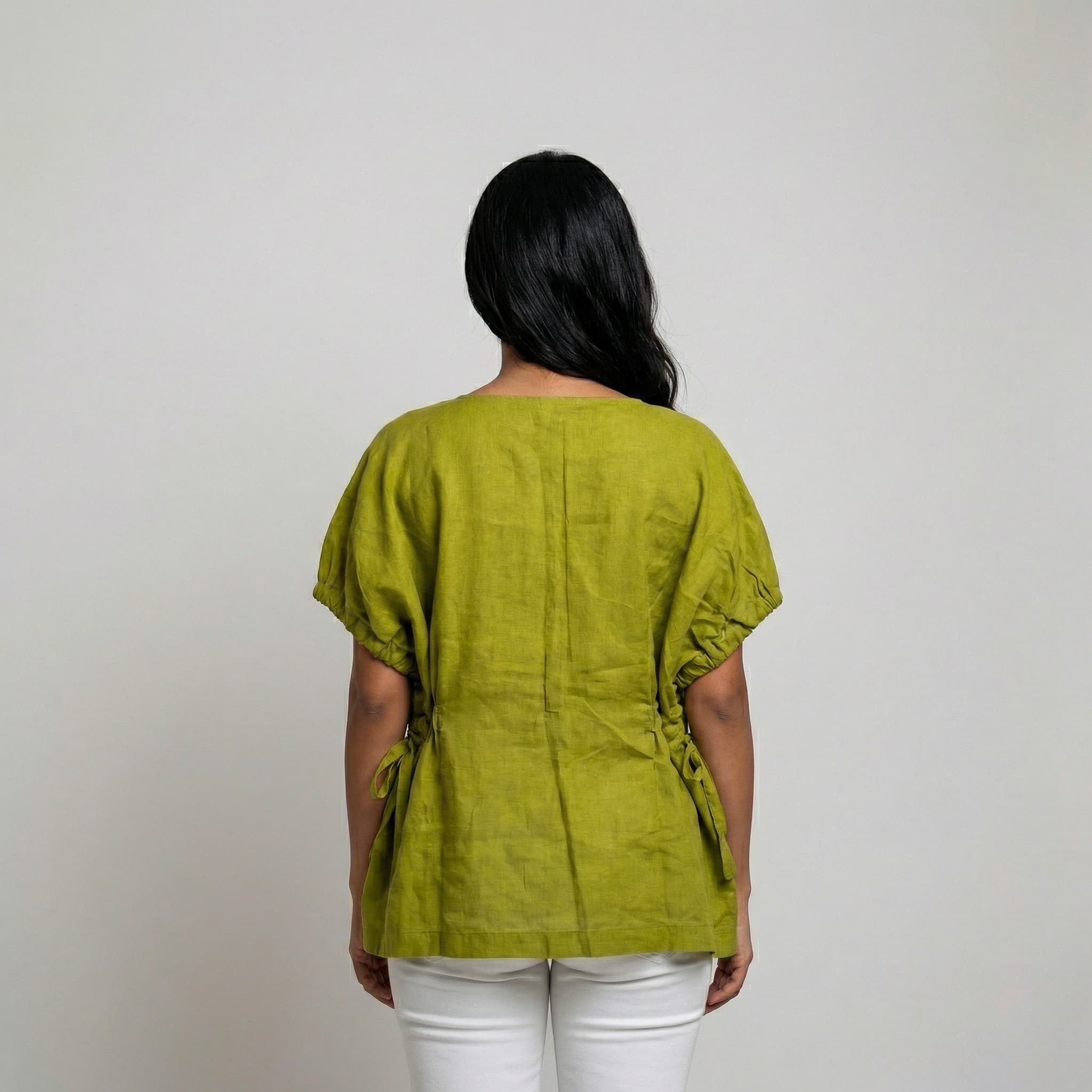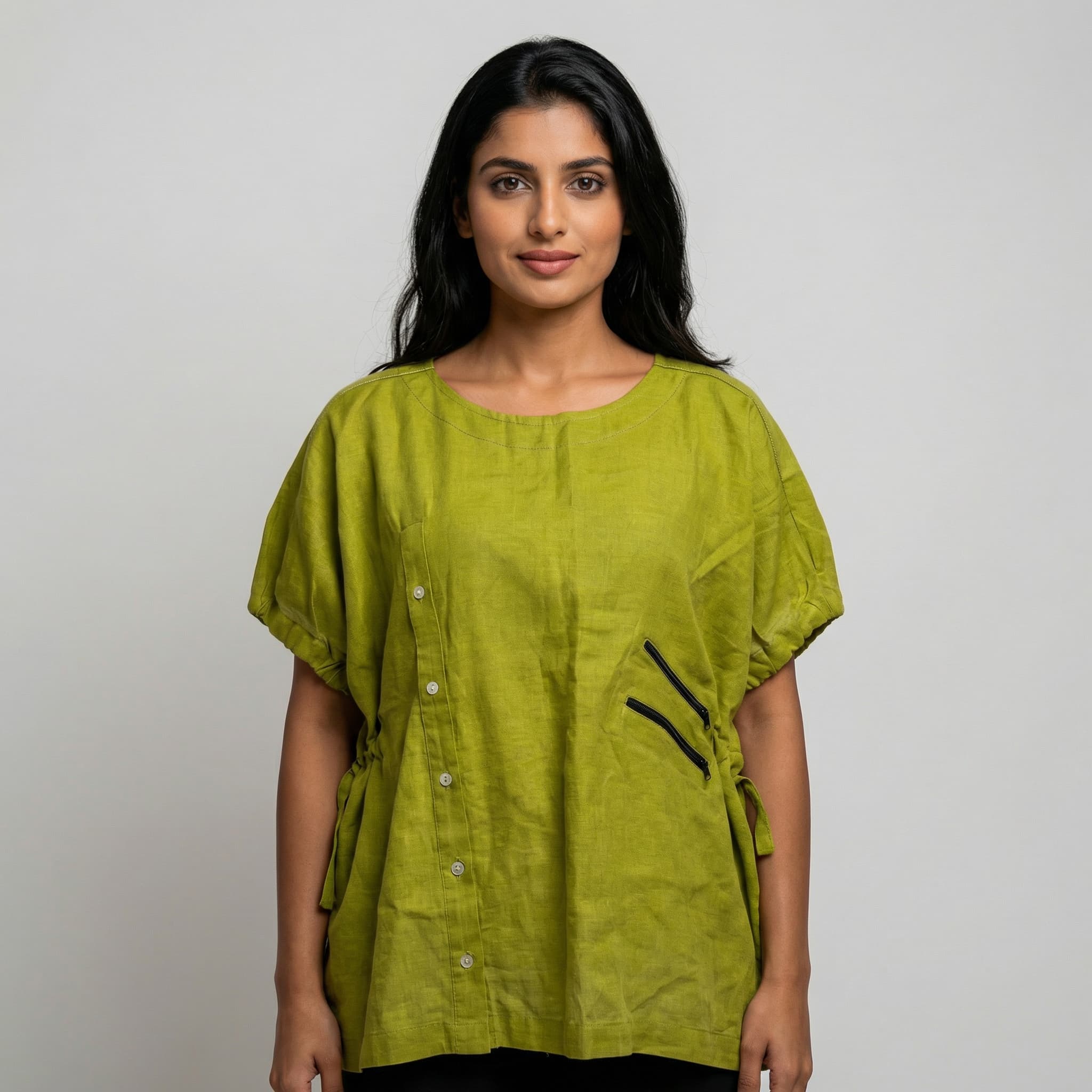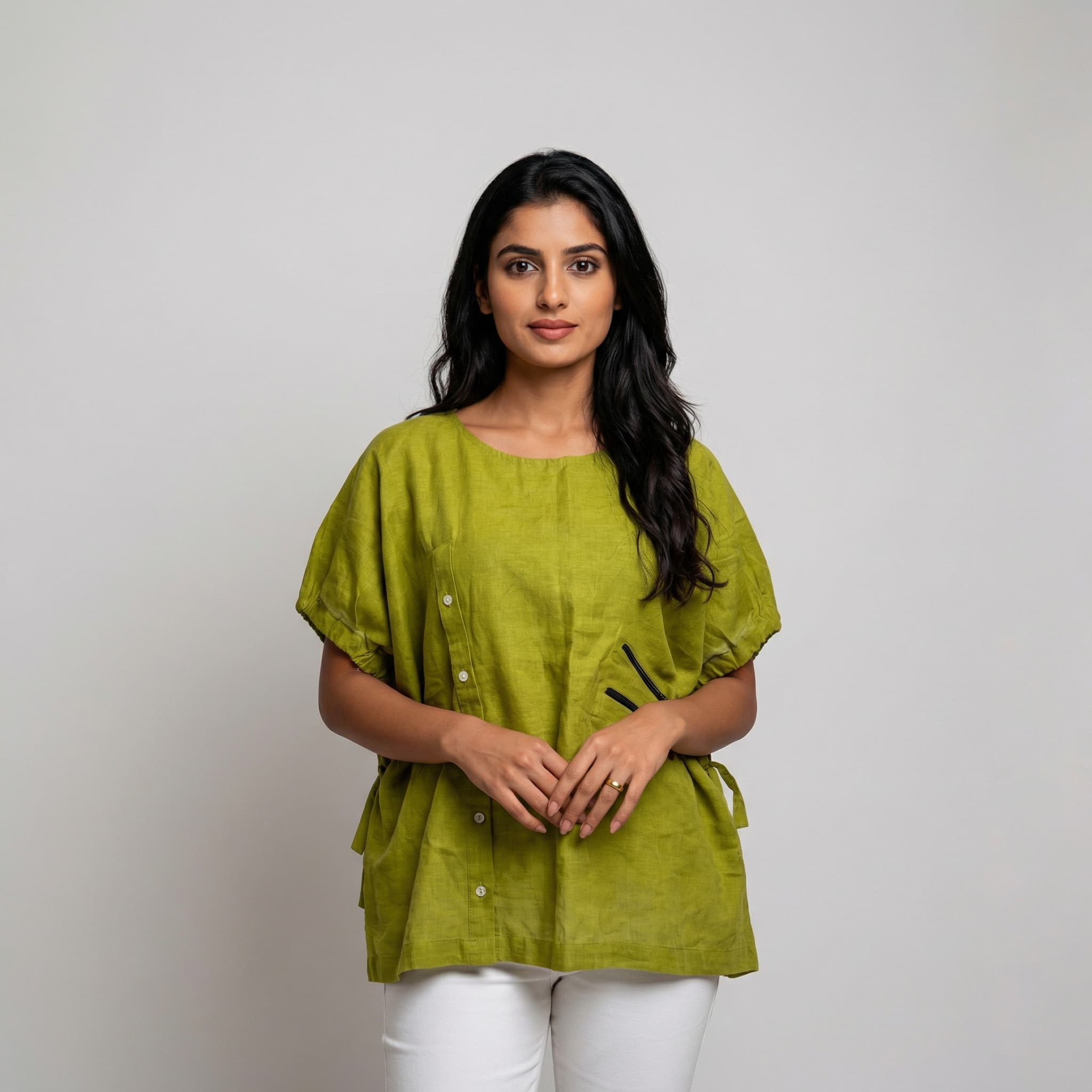 This lime‑green loose kaftan top is woven from a lightweight, airy cotton‑linen blend that feels cool against the skin. The natural fibers offer excellent moisture‑wicking properties, keeping you comfortable from morning to night. The relaxed drape ensures the garment moves freely, making it ideal for warm days or breezy evenings.
