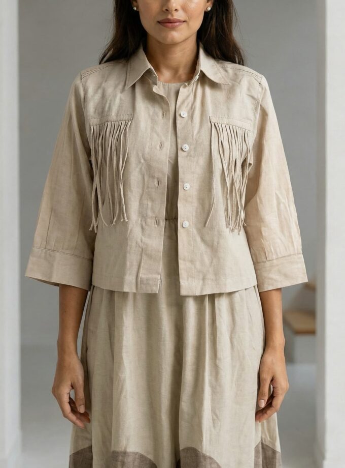 Top: Relaxed, slightly oversized silhouette that gently skims the body; tassel trim at the neckline adds a playful, feminine touch